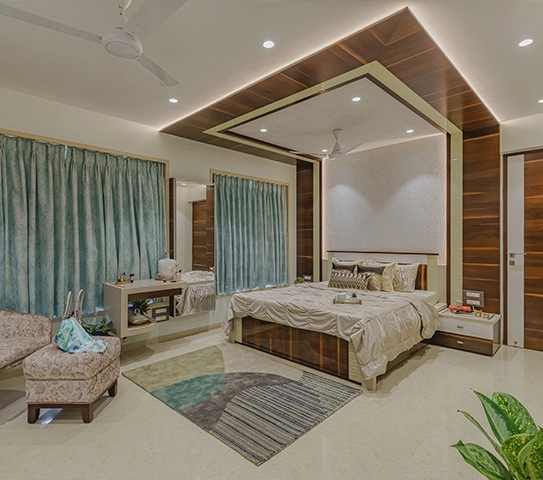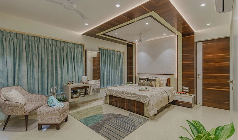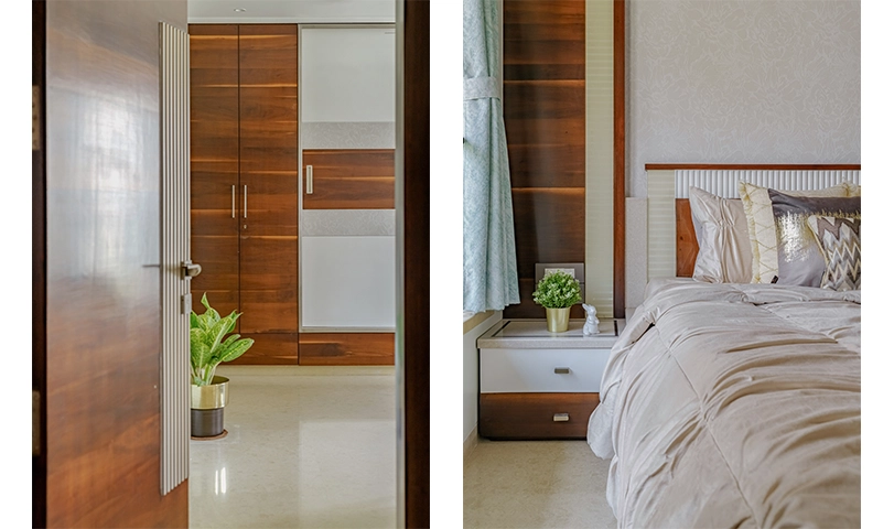 Clean and simple, with ample storage, the home is finished in an exotic jungle veneer which has dense and rich veins. This becomes the dominant highlight of the design, toned down by mild and warm color tones on walls. Natural tones and a clever blend of warm and cool shades, sprinkled with pops of color, make up the palette of the entire home.