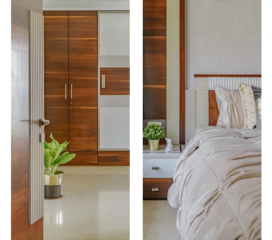 Clean and simple, with ample storage, the home is finished in an exotic jungle veneer which has dense and rich veins. This becomes the dominant highlight of the design, toned down by mild and warm color tones on walls. Natural tones and a clever blend of warm and cool shades, sprinkled with pops of color, make up the palette of the entire home.